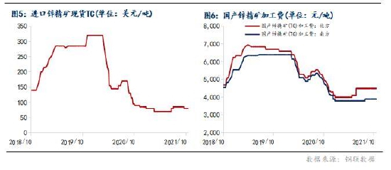 锌精矿,国内锌精矿未来的增量较为有限,海外锌矿产能增长不及预期,预计2022年锌精矿加工费低位缓慢抬升,成本端给锌价一定支撑。