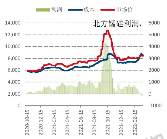 2022年1季度锰硅利润持续回落,北方利润仍然好于南方。锰硅生产利润回落的主要原因在于成本锰矿的迅速上涨。由于锰矿在去年下半年开始进口就有所减少,高品矿紧张,而年初锰硅产量处于高位,使得锰矿的价格大涨压制了锰硅的生产利润。