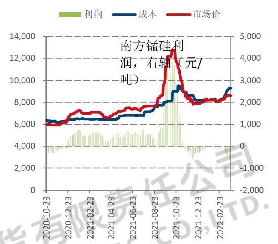 2022年初锰矿进口利润由负转正,先扩大但3月下旬后又有所缩小,随着锰硅生产企业复产,锰矿港口价格明显回升,使得锰矿进口即期利润回升;但随后外矿大幅上调远期售价使得进口矿利润又随之回落,利润往上游转移。