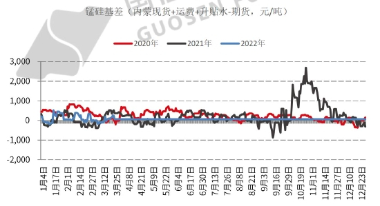 硅铁现货价格上涨,2022年1季度青海现货价格上涨850元/吨至9000元/吨,但期货涨幅更大使得基差由正转负,期货转为升水现货。标志性钢厂的招标价格回落后有所回升。2022年1月河钢招标价8600元/吨较2021年12月的10900元/吨大幅回落后,3月招标价回升至9200元/吨。