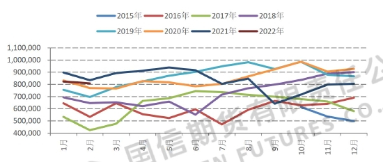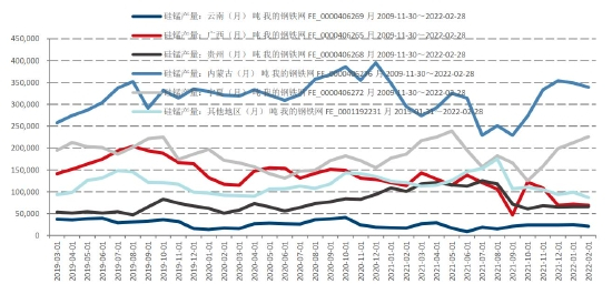 锰硅需求主要在炼钢行业,也有小部分用于铸造等。而炼钢行业中,锰硅用量最大的品种是钢筋,也就是我们经常说的螺纹钢。国家统计局最新数据显示,2022年1-2月份,中国钢筋产量为3481.8万吨,同比下降13.8%。1-2月份,中国中厚宽钢带产量为2850.2万吨,同比下降3.3%。1-2月份,中国线材(盘条)产量为2130.7万吨,同比下降16.7%。1-2月份,中国冷轧薄板产量为631.6万吨,同比下降0.1%。1-2月份,中国焊接钢管产量为661.2万吨,同比增长1.6%。1-2月份,中国铁合金产量为549.4万吨,同比下降9.2%。1-2月份,中国铁矿石原矿产量为15575.7万吨,同比增长7.5%。