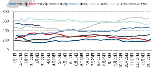 由于进口减少以及需求的恢复,锰矿港口库存继续去化。根据上海钢联的数据,截止2022年3月18日锰矿钦州港和天津港库存合计496.7万吨,同比下降22.45%。