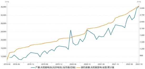 在双碳背景下,国内太阳能行业发展较快,粗略估计,太阳能1百万千瓦需要约120吨锡。根据国家统计局数据显示,2022年10月太阳能电池产量3100.4万千瓦,环比增加4%,同比增加70%;1-10月累计产量25383.3万千瓦,同比增加34%。2018年以来国内太阳能发电装机容量快速增长。2018-2021年期间4年,国内太阳能装机容量增长约2亿千瓦,年均增长月0.5亿千瓦。相应的,太阳能电池产量也呈现较快增长。2022年5月份,发改委、能源局表示,计划到2030年我国风电、太阳能发电总装机容量达到12亿千瓦以上。目前国内风电、太阳能发电装机容量约6亿千瓦,因此到2030年预计太阳能发电装机量将增加约3亿千瓦,估算需要消耗月36000吨锡锭,年均消耗4000吨锡锭。