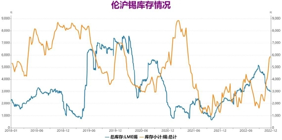 库存方面,截至2022年12月16日,伦沪两市总库存为8901吨,较上年底增加5621吨,增幅171.3%。其中LME锡库存报3005吨,较上年底增加985吨,增幅为48.8%,在2022年海外库存自低位有所回升,因2022年海外需求减弱但生产端也受到影响,因此增幅相对较小。同期上期所锡库存报5896吨,较上年增加4636吨,增幅为367.9%,2022年沪锡库存自历史低位水平出现明显回升,主要因2022年国内终端需求下滑明显,冶炼生产基本恢复正常。整体来看,2022年国内库存均呈现增长,资源紧张局面较上年有所改善。