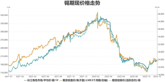 截止2022年12月20日,沪锡期货指数年内运行区间为152120-393770元/吨,年下跌34.4%,相应的伦锡运行区间为17350-51000美元/吨,年下跌37.8%。