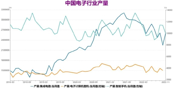 电子行业方面,根据国家统计局数据显示,2022年1-11月集成电路累计产量2958亿块,同比减少12%。2022年1-10月电子计算机整机累计产量36741.7万台,同比减少8.3%。2022年1-11月智能手机累计产量109241万台,同比减少3.7%。从数据来看,2022年电子行业重点产品产量同比均大幅下降,主要因上年同期的高基数影响,以及2022年市场消费信心不足,且电子产品迭代缺乏创新,使得消费型电子产品需求受到较大冲击。并且美国对中国Xin片行业采取了一系列的限制措施,也对市场的发展造成较大阻力。展望2023年,消费电子产业链较长且分工明确,主要包括上游Xin片、中游零部件及组装、下游品牌等,上游Xin片厂商同时存在过去产能紧张下的备货、下游需求疲软问题,库存问题相对突出,未来伴随需求逐步回暖,预计将在二季度后开始逐步好转。