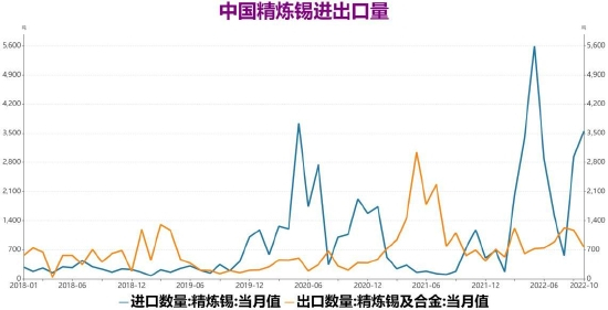 根据海关数据显示,2022年1-10月,我国累计进口精锡已达到2.3万吨,同比增长532.4%;累计出口精锡8612吨,同比下滑34.7%;前十个月我国已累计净进口精锡1.4万吨。2022年10月我国精锡进口量为3512吨,环比上涨21.9%,同比增长387.1%,来自印尼的进口锡锭占进口总量比达到88%;10月精锡出口量减少至763吨,环比下滑34.8%,同比增长35.8%。精锡贸易方面,从8月开始内外盘价差持续扩大,10月内外盘价差仍保持在8000元/吨以上,进口量增加明显。但是到了11月,由于人民币汇率止跌回升,以及海外锡库存大幅下降,使得进口窗口快速重回关闭状态;此外,11月印尼精锡出口量继续减少,连续三月环比下降。展望2023年,预计年初精锡进口量将回落至较低水平,并且海外能源紧张问题可能需要到二季度才开始好转,国内进口窗口打开也可能要到三季度,整体来看2023年精炼锡进口量预计将较2022年有下降。