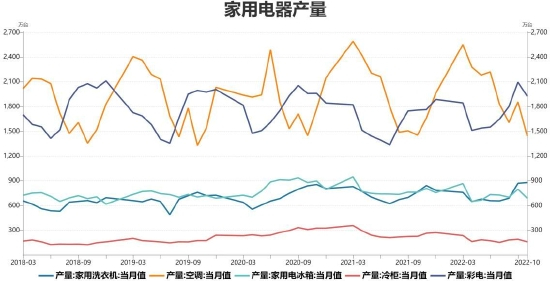 家电方面,根据国家统计局数据,2022年1-10月,家用洗衣机产量7318万台,同比增加5%;空调产量18959.5万台,同比增加4.8%;家用电冰箱产量7159万台,同比减少3.4%;冷柜产量1879.2万台,同比下降23.9%;彩电产量16139.6万台,同比增加8.4%。据产业在线数据,2022年1-10月累计产量12595万台,同比下降3.5%;销量12913万台,同比下降1.7%,其中内销7389万台,同比增加0.1%,外销5524万台,同比下降4.0%。2022年7-8月份的持续性高温刺激了空调市场的消费力释放,但也带来了市场的提前消耗。四季度家用空调断崖式的排产下滑除了因为行业本身处于淡季外,也有前期市场过度消费的原因。展望2023年,一季度随着行业进入去库存周期,需求不足的情况下势必会减少生产;长期来看,随着房地产融资环境放松,二季度有望好转,叠加夏季的传统需求旺季,预计空调需求将迎来明显回升。