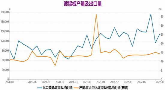 根据国家统计局数据,2022年1-10月主要镀锡板企业累计产量139.09万吨,同比下降12.6%,累计销量134.79万吨,同比下降12.16%。据Mysteel监测的26家镀锡板生产企业中,共计49条产线,2022年11月份产能利用率61.91%,月环比下降4.54%,同比下降12.09%;11月镀锡板实际产量38.47万吨,月环比减少1.62万吨。调研数据显示,11月份国内马口铁供应持续下滑,6月-11月受诸多因素银影响达产率始终难有提升。据调研反馈,11月河北、江苏等地疫情防控,原材料运输、工人居家等对产线影响较大,因此供应商有环比明显下滑。出口方面,2022年10月我国镀锡板出口总量共计14.37万吨,同比增幅9.65%。2022年1-10月我国镀锡板出口总量共计144.51万吨,同比增幅35.83%。前三季度出口订单表现较为主要是国外需求拉动,加之国内价格对出口有利,但四季度出口同比开始下滑。2022年受到疫情影响,企业生产以及下游消费都受到较大的冲击。展望2023年,随着2022年年底开始,国内多地陆续出台优化调整疫情防控措施,预计镀锡板企业生产以及终端消费将逐渐得到恢复。不过在宏观经济压力较大,以及镀锡板产业链复苏需求时间的情况下,预计2023年下半年镀锡板产销才能出现明显改善。