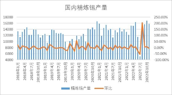精炼锡产量方面,2022年1-11月中国精炼锡产量总计15.16万吨,同比增加0.23%,2022年国内精炼锡生产整体得到恢复,主要因锡矿进口供应增加,炼厂原料紧张局面有所缓解,不过年中由于锡价大幅下滑,炼厂为缓解生产压力进行集中减产操作。其中11月精炼锡产量15806吨,同比增加19%。目前国内炼厂对于环保限产、缺电限电的影响已经减弱,开工生产基本恢复有序,但主要还面对锡价出现大幅下跌的情况下,将对炼厂的生产利润造成较大的冲击。展望2023年,在锡矿供应趋于稳定的情况下,国内炼厂生产意愿将继续保持,但可能受到锡价的大幅波动而波动,全年精炼锡产量预计将有所增长。