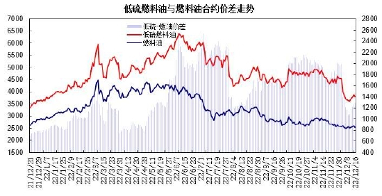 11月上旬,美联储加息75个基点但暗示12月可能放缓加息步伐,OPEC+减产及欧洲禁止海运俄罗斯原油窗口临近,国际原油震荡上涨,新加坡燃料油现货价格回升,低硫与高硫燃油价差回落,燃料油期货主力合约从2600元/吨区域逐步回升至2900元/吨上方;低硫燃料油震荡上涨,主力合约触及4960元/吨高点,处于5000元/吨高点关口震荡。中下旬,亚洲地区新冠病例连续增加,全球经济衰退和能源需求放缓的忧虑情绪打压市场,国际原油大幅回落调整;新加坡燃料油销售增长,燃料油表现强于低硫,低高硫价差探低回升;燃料油震荡回落,主力合约从3000元/吨关口回落至2500元/吨区域,低硫燃料油回落调整,主力合约从4800元/吨区域下跌至4000元/吨关口。