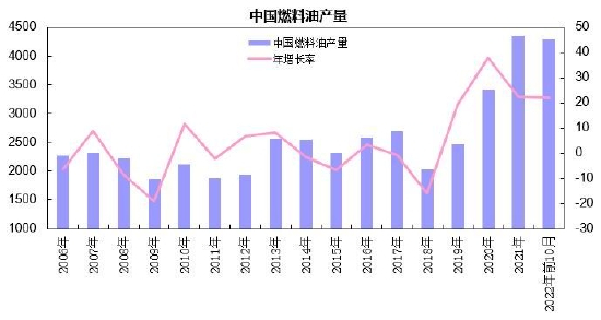 国家统计局数据显示,2022年1-10月中国燃料油产量累计为4283.3万吨,较上年同期增加805万吨,累计同比增幅为22%;国内炼厂低硫燃油产能继续投产,燃料油产量呈现较快增长态势。