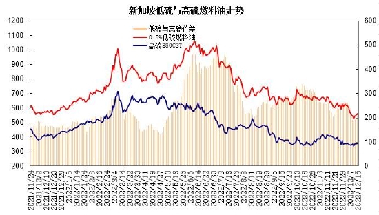 截至2022年12月全球高硫燃料油浮仓约380万吨,较上年增加约200万吨,其中新加坡海域高硫浮仓约180万吨,低硫燃料油浮仓约124万吨。欧盟将于2023年2月禁止进口俄罗斯的石油产品,俄罗斯高硫燃料油出口逐步转向亚洲。预计2023年新加坡燃料油库存趋于增长,高硫库存压力高于低硫燃料油。