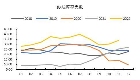 数据显示,2022年11月,我国纱线库存为34.02天,同比上年增长34.15%;坯布库存39.08天,同比上年增长22.55%,行业去库存还有很长一段路要走。