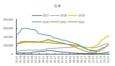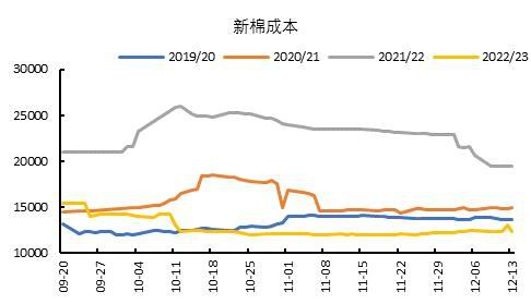 因上年轧花厂亏损,企业对期货套保需求提高,成本线以上面临较大的仓单压力。截至2022年12月22日,棉花仓单量折皮棉为11.62万吨,同比减少78.62%。当前棉花仓单注册速度有所加快,预计随着期价的回升,压力将逐渐增多。