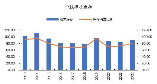 2022/23年度,全球棉花产量基本稳定,全球棉花消费继续萎缩。根据USDA12月供需报告显示,2022/23年度,全球棉花产量预计2522.91万吨,与上一年度持平;全球消费量预计2435.06万吨,同比下降4.86%;全球棉花期末库存预计1954.41万吨,同比增长4.82%;库存消费比0.8,比上年上升7个百分点。
