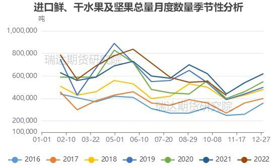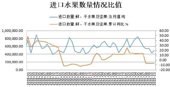 从季节性消费来看,每年的4月和8月为进口水果数量的峰值月份,且上半年水果进口量多于下半年。11月疫情防控逐渐放开后,我国进口水果量也出现增加走势,预计2022年我国进口水果量超730万吨,高于去年同期水平。据海关总署,2022年11月我国进口水果为49.8万吨,环比增加5.2万吨或12.1%,2022年1-11月我国已累计进口水果698万吨,累计同比增加4.5%。分水果品种来看,进口火龙果、柠檬、葡萄等增加为主。中长期来看,2022年秋冬季国产水果多数出现减产,部分品种供应趋紧,加之防控措施放开后,将进口性价比较高的水果来弥补国内稀缺的品种类,预计2023年我国水果进口量继续小幅增长态势。