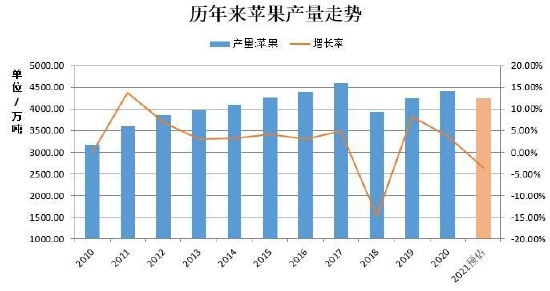据中国苹果协会知,伐树造成果园面积下滑,且花期阶段遇上高温、冰雹、霜冻等不良天气,影响苹果生长,西北、山东等地苹果套袋数据均出现同比下滑的现象,2022年苹果减产已成大概率。不过市场上各类机构调研数据显示,新产季全国苹果冷库总量数值大致在840-870万吨区间内,与上年度库存相比差距不大,可见新产季苹果减产幅度不及市场预期。据国家统计局知,2021年全国苹果产量为4597.3万吨。