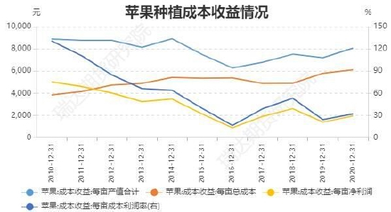 生产物料成本逐渐上抬,导致总成本值跟随上涨趋势。从成本角度分析,2020年苹果每亩总成本6113元,较上年度增加了320元。但平均每亩净利润走势出现反转,较上年度增加了540元至1954元附近,由于近几年产地苹果网络销售、超市连锁、社区团购等直发销区市场比例增加,省去了部分中间环节的相关费用,进一步提升苹果销售利润。新产季新季晚熟富士80#一二级以上苹果平均收购价格为3.6-3.8元/斤区间,折算后收购成本大致7200-7600元/吨,收购成本支撑苹果市场。