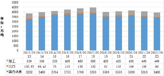 中国苹果的需求主要分为国内消费、加工、和出口。其中国内鲜食消费占绝大比例,而加工方面则为460万吨,出口为110万吨左右,分别占苹果需求的10%和3%。鉴于中国对水果的消费注重于营养价值和新鲜度苹果,后期中国苹果消费增长将有所放缓甚至出现饱和状态。出口和加工的变化则相对平缓,加工方面大多维持在460万吨左右,出口则保持在100万吨附近。
