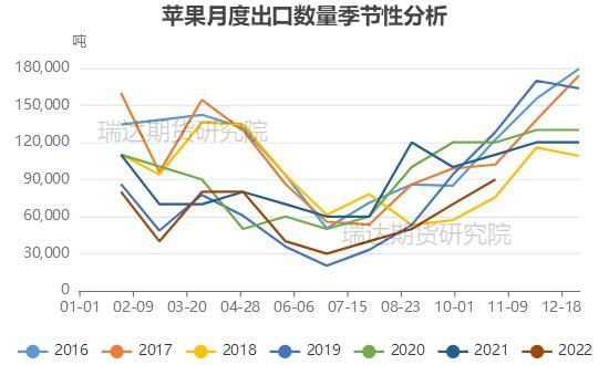 苹果生产的季节性决定了苹果消费具有明显的季节性特征,特别是秋冬季节的苹果消费相对较多,其中圣诞、元旦以及春节期间的苹果消费相对旺盛。而夏季需求相对较少,特别是进入5月份后,随着其他时令鲜果的上市,苹果的消费需求为刚需,其他水果替代效应增强。我国的富士苹果主要是晚熟品种,大多数苹果在秋季的9月开始逐渐上市。再者,我国苹果消费主要以鲜果消费模式为主,占比在85%左右,当然也包含损耗量;12%为深加工,出口量占比较为低。