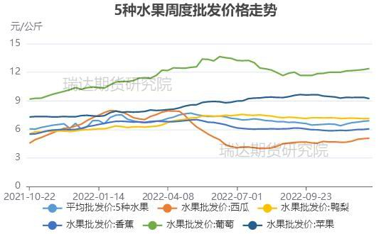 一般来说苹果、蜜桔以及鸭梨品种生长周期较为贴近,价格走势亦有所趋同,但也受天气、时间错配等因素影响,同期价格出现略有不同的走势。如2022年多数水果价格维持历史相对高位,秋冬季主要水果收购价格较往年上调幅度明显,且批发价格维持坚挺。不过2022年春节时间较早,蜜桔不易储藏,加之富士苹果入库较高,预计春节后水果价格回落的可能性较大,水果之间竞争愈发明显。而我国香蕉生长领域划分的不同,导致香蕉价格的阶段性特征较为混乱。新季度水果市场供应仍处于相对宽松状态,水果之间替代作用不减。