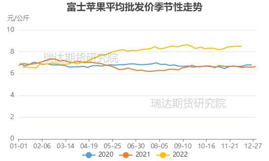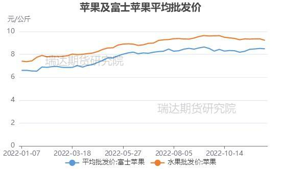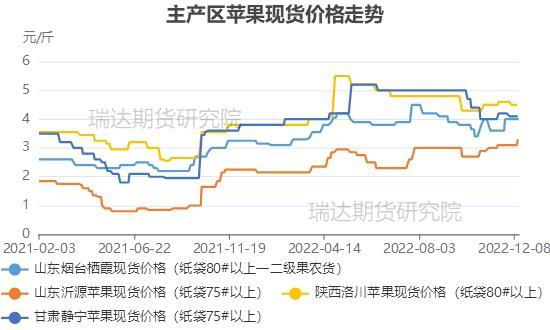从苹果产区角度而言,截止2022年12月20日,山东栖霞纸袋80#以上一二级苹果价格为4.0元/斤,相较于1月的3.15元/斤上涨了0.85元/斤;陕西洛川纸袋80#以上苹果价格为4.5元/斤,相较于1月的3.80元/斤上涨了0.70元/斤;甘肃静宁纸袋75#以上苹果价格为4.1元/斤,相较于1月的3.8元/斤上涨了0.3元/斤。2022年年末数据来看,现货价格多数高于去年同期水平,由于新产季晚熟富士收购价格高于上年同期0.8元/斤附近,加之其他替代水果价格均处于近年来历史高位,对富士苹果价格起到一定的支撑作用。另外阶段性节日需求备货增加,优质苹果现货价格维持坚挺状态。