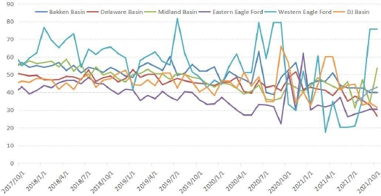 2021年6-7月份美国原油平均开采成本已经下降至35美元/桶左右,但2021年10月底美国平均开采成本又回升至42美元/桶附近。随着通胀和人力成本上升,2022年美国页岩油开采成本也在增加。据美国能源信息署的数据,2020年6月美国随时可开采的油井超过8800口,达到峰值水平,然而到了2022年2月,这一数据下降至4400口以下,创2013年末以来最低水平。美国页岩油开采虽然迅速,但是油井枯竭速度也很快,生产商要不断钻探才能有足够油井可开采。但是由于疫情,许多页岩油生产商减少钻探,如今必须加倍钻探才能弥补之前大减的库存油井数量。随着劳动力等成本上升,即使增加投资也无法快速增加页岩油产量,一些规模较小的页岩油生产商因为经营成本高涨和很难找到足够人手,不得不放慢原油开采速度。为应对供应链紧张局面,美国总统拜登不顾环境影响以增加原油产量。拜登政府2022年6月向石油和天然气公司提供在联邦土地上在至少8个州的钻探权。