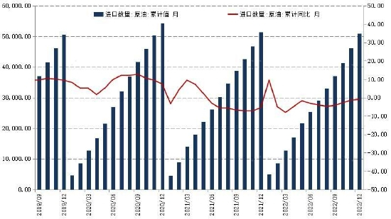 我国原油消费量有近70%需要通过国际市场进口。海关总署数据显示,2022年12月份我国原油进口量为4807万吨。2022年1-12月份我国累计进口原油50828万吨,累计同比下降0.9%。
