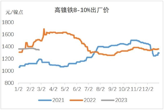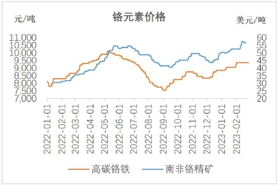 海外铬铁供应不确定性较高,南非和津巴布韦电价上涨,减产压力加大,这两个国家占中国进口量的60%。土耳其地震导致该国铬铁暂停出口,哈萨克斯坦也减少对中国散单的分销,铬铁进口量预计会持续受到负面影响。不过据了解,国内高碳铬铁现货并不紧缺,只是贸易商不想过早出货。青山3月高碳铬铁招标价9395元/50基,环比上涨250元,提振市场信心。高碳铬铁相比高镍铁走势偏强。