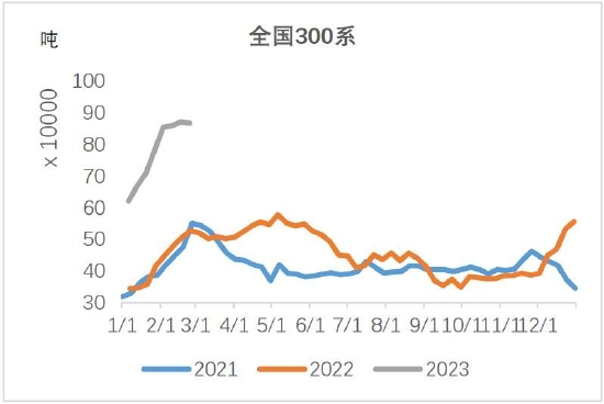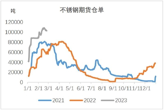 2月中旬以来,社会库存维持在140万吨附近,300系总库存基本趋稳不再增加,但去库速度还是非常缓慢。截至2月23日,全国主流市场不锈钢社会库存总量141.06万吨,月环比增长21.9%,其中300系库存86.71万吨,月环比增长22.4%。现货基差近期走强,有利于仓单注销。钢厂300系厂内库存还在增加,压力暂时由钢厂自己承担,没有完全转移至现货或期货上。