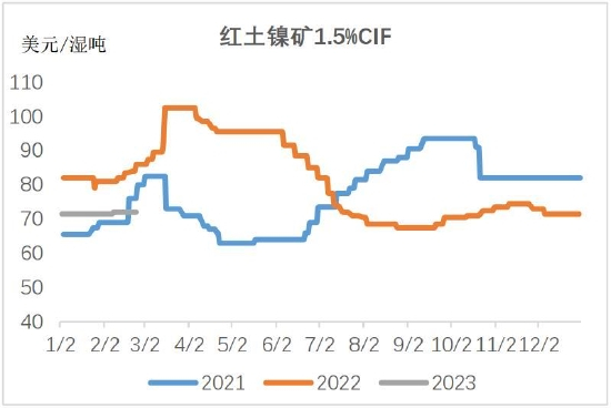 镍矿方面,进入2月后,国内部分停产检修的镍铁工厂虽陆续开始恢复生产,但国内市场整体需求没有明显提升,而且国内市场大部分需求集中在少数镍铁工厂手中,工厂采购意向价格与贸易商镍矿进口成本倒挂,倒逼镍矿价格下调;同时由于供需双方对价格存在分歧,市场成交也比较困难。3月菲律宾将逐渐走出雨季,出口逐渐增加,海运费先开始上涨,然后是FOB价格逐渐松动。印尼的镍矿内贸基准价参考LME前两个月的平均价计算,2月基准价环比上涨3.5%。2月LME价格下跌,3月基准价预计环比下调。综合来看,镍矿3月中下旬可能将出现拐头向下的走势。