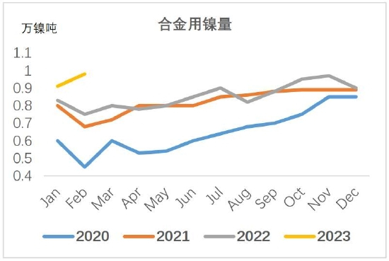 2月LME镍价下跌,国内社会库存小幅增加,虽然远不及LME去库幅度,但调研显示现货市场货源充裕,下游只在20万附近入场采购,因此现货升水承压下行。相比上个月末,金川镍升水下跌2350元/吨,俄镍升水下跌4350元/吨。二者有分化,一方面是因为俄镍现货进口盈利,促进保税区库存清关;另一方面是因为军工方面的合金订单增长较快,这部分刚需只用金川镍。