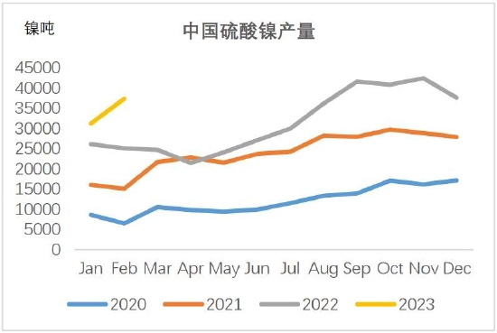 2月国内硫酸镍产量预计3.73万吨,环比增加19.7%。1月份硫酸镍产量环比下降还是因为下游需求不足倒逼上游降价减产。2月产量恢复却不是因为三元电池产业链回暖,只是纯粹被转产电积镍的需求占用。前驱体价格下跌快于正极,正极材料生产企业按即期价格计算有利润,但产量却没什么起色,据了解可能因为前期原料库存成本偏高,生产反而是亏损的缘故。只能耐心等待下游需求回暖。预计3月因为纯镍和硫酸镍套利空间缩窄,硫酸镍价格恐怕难以维持高位,产量也有小幅减少。
