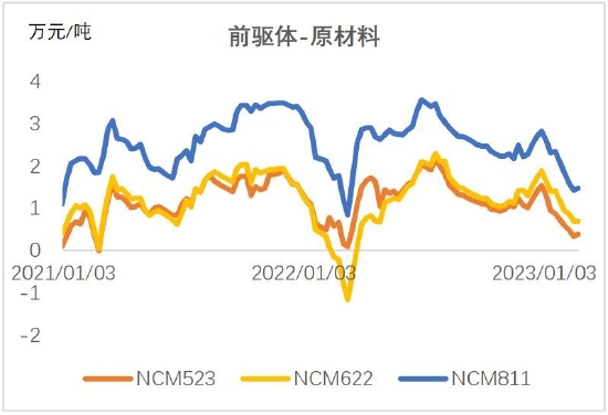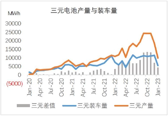 硫酸镍价格2月持续反弹,与纯镍价差已从6万高点收窄至2万元/吨以内。与此同时碳酸锂价格仍在快速下跌,宁德时代传出锂矿让利计划,价格战已经在悄悄开始,头部一体化企业优势明显。三元电池需求没有起色,正极材料和前驱体开工率在50%上下,前驱体价格跟随原料下跌更快,正极相对滞后,未来可能会加速下跌。