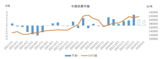 从国内镍的平衡表中可以看出今年1月是过去两年中过剩最大的月份,主要因为下游耗镍环比大幅减少,而供应没有相应的下降。2月随着下游不锈钢厂和硫酸镍复产,供需会有一定改善,过剩有所收窄,3月预计还会延续供需两旺的状态。