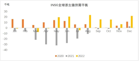 INSG统计全球原生镍2021年短缺将近17万吨,2022年过剩11万吨,2023年预计过剩进一步扩大到17万吨。今年过剩加剧是当前市场的一致预期,需要关注节奏和库存拐点。