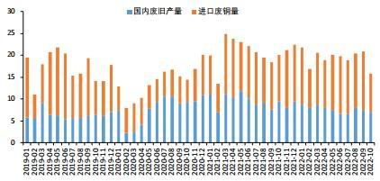2022年受新财税政策及疫情影响,国内铜产量大幅下滑,1—11月我国废铜产量累计为83万吨,同比下降20.5%。