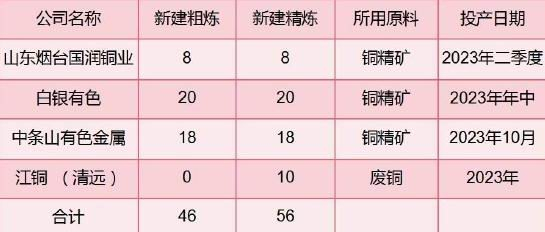 2022年中国铜粗炼和精炼产能快速增长,根据统计数据,2022年中国铜粗炼和精炼产能分别新增58万吨和新增100万吨。2023年铜粗炼和精炼产能预计将分别增加46万吨和56万吨,国内新增产能提速。2023年2月14日,中色大冶弘盛铜业40万吨高纯阴极铜清洁生产项目开始投产,新增冶炼端整体呈稳定增长态势。