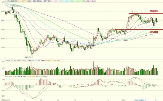交易策略上,建议前期低位中线多单减仓后继续持有,场外可波段做多。预计3月伦铜参考运行区间为8500-9400美元/吨,沪铜参考运行区间为67500-71000元/吨。请参考图21、图22。