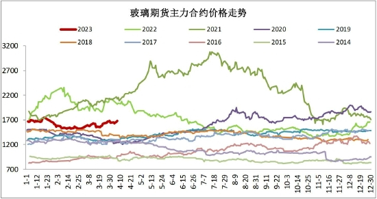 春节前玻璃产业链恢复正常的生产流通秩序,下游在对需求的憧憬中积极备货,期货价格从近三年低位企稳上行,期货主力合约价格于春节前后创出一季度价格高点1762元。春节过后,玻璃生产企业库存在前期高基数上进一步累积,期货价格因此承压调整。对房地产企业及玻璃深加工企业资金状况的担忧阶段性放大了市场的悲观情绪,玻璃盘面价格走势领跌建材板块。