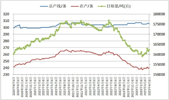 供给方面自2022年二季度末以来持续波动减量,在罕见的持续亏损压力下,玻璃行业经历了自发的产能出清过程,浮法玻璃在产日熔量从去年年中高点176825吨/天降至2月中旬低点159030吨/天,降幅10.06%。国家统计局公布的数据显示,1-2月份全国生产平板玻璃15360万重箱,同比降低6.6%。当前浮法玻璃自发产能出清告一段落,冷修产线开始复产点火,产能拐点已经确立。截至4月6日,全国浮法玻璃生产线共计306条,在产240条,日熔量162180吨。