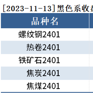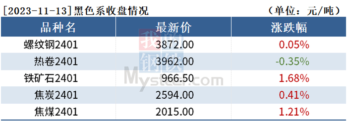截至11月13日收盘,螺纹钢2401收3872元/吨,涨0.05%;热卷2401收3962元/吨,跌0.35%;铁矿石2401收966.5元/吨,涨1.68%。