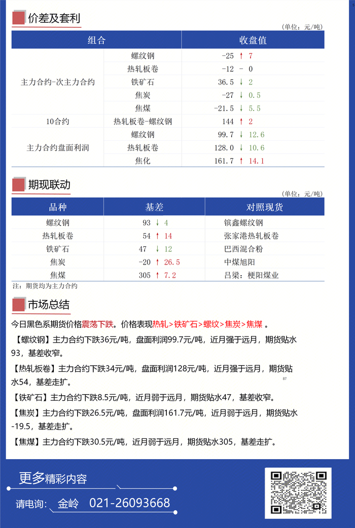 今日黑色系期货价格震荡下跌。价格表现热轧>铁矿石>螺纹>焦炭>焦煤 。【螺纹钢】主力合约下跌36元/吨,盘面利润99.7元/吨,近月强于远月,期货贴水93,基差收窄。【热轧板卷】主力合约下跌34元/吨,盘面利润128元/吨,近月强于远月,期货贴水54,基差走扩。【铁矿石】主力合约下跌8.5元/吨,近月弱于远月,期货贴水47,基差收窄。【焦炭】主力合约下跌26.5元/吨,盘面利润161.7元/吨,近月弱于远月,期货贴水-19.5,基差走扩。【焦煤】主力合约下跌30.5元/吨,近月弱于远月,期货贴水305,基差走扩。