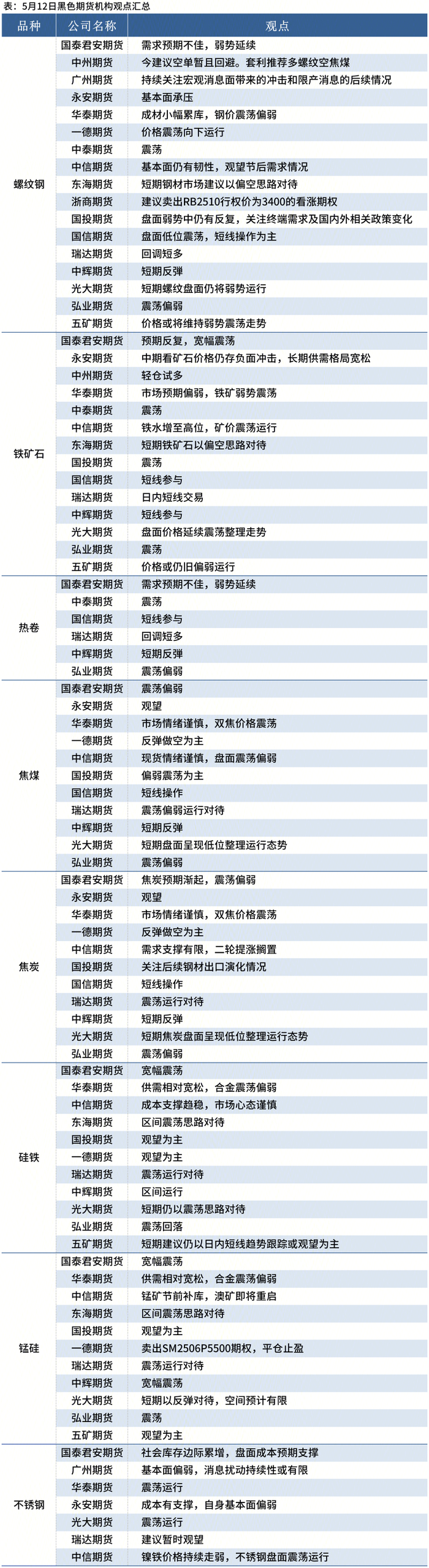 据Mysteel统计5月12日17家期货机构操作策略,其中多数机构料螺纹钢震荡偏弱,铁矿石震荡运行,焦煤、焦炭震荡偏弱。具体汇总内容如下: