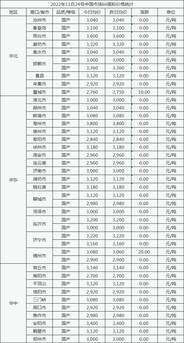 11月24号中国市场60面粉价格小幅上行