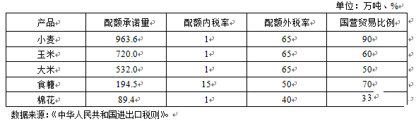 对于实施单一关税的农产品进口,我国的管控手段仅限于征收有限的关税。对于实施关税配额管理的农产品(表5),以配额外关税税率的进口我国也是完全放开的,没有任何调控手段。