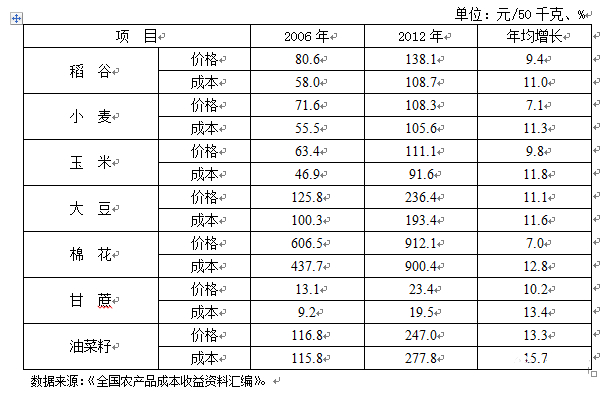 大宗农产品内外价差扩大的直接原因是国内生产成本的快速上涨。近年来,我国农业劳动力机会成本快速上升、土地成本更加显性化、环境保护成本和质量安全投入不断增长、其他物质成本也快速增加,所有这些使我国农业进入了成本快速上涨时期,大宗农产品生产成本与瑞士日韩的水平日趋接近。2006-2012年,我国水稻、小麦、玉米、棉花、油菜籽、甘蔗的生产成本年均增长率分别为11%、11.3%、11.8%、12.8%、15.7%、13.4%,成本上升必然推动价格上涨,同期这些产品的国内价格年均增长率分别为9.4%、7.1%、9.8%、7%、13.3%、10.2%(表2)。有些人把农产品价格上涨归因于最低收购价、临时收储等支持政策,这是没有道理的。事实上,粮棉油糖价格涨幅均低于成本涨幅,价格提高还没能完全消化成本的上涨。