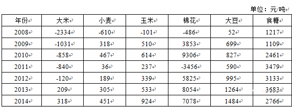 2008年,除大豆外,我国大宗农产品国内价格都低于国际离岸价格,其中大米、小麦、玉米、棉花每吨分别低2334元、610元、101元、486元。到2013年,大宗农产品国内价格全面高于国际市场离岸价格,大米、小麦、玉米、大豆每吨分别高209元、305元、533元、1264元,棉花、食糖每吨分别高8054元、3683元。2014年1-5月,谷物和大豆内外价差继续扩大,大米、小麦、玉米、大豆每吨分别高318元、451元、924元、1484元。棉花、食糖价差有所回落,分别为7078元、2766元,主要是因为国内价格受进口打压而下跌(表1)。