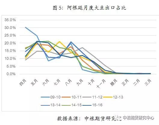 第三,由于大豆的主要生产国和主要需求国并不是完全重叠的,因此形成了全球大豆贸易流。其中美国、巴西、阿根廷是主要的大豆出口国家,但是这三个国家的大豆作物生长周期是错开的,因此在全球出口市场中出口高峰期不同。其中美国大豆出口高峰期在10月到次年1月,期间出口占全年出口的比例在50-70%。巴西大豆出口高峰期在3月到7月,期间出口占全年出口的比例在65-75%。阿根廷大豆出口高峰期在4月到6月,期间出口占全年出口的比例在40-65%。从中也能看出三国之间存在一些竞争关系,主要竞争关系体现在1-2月份期间美国大豆和巴西大豆竞争,由于阿根廷大豆出口占比不高,巴西和阿根廷之间的竞争不突出。